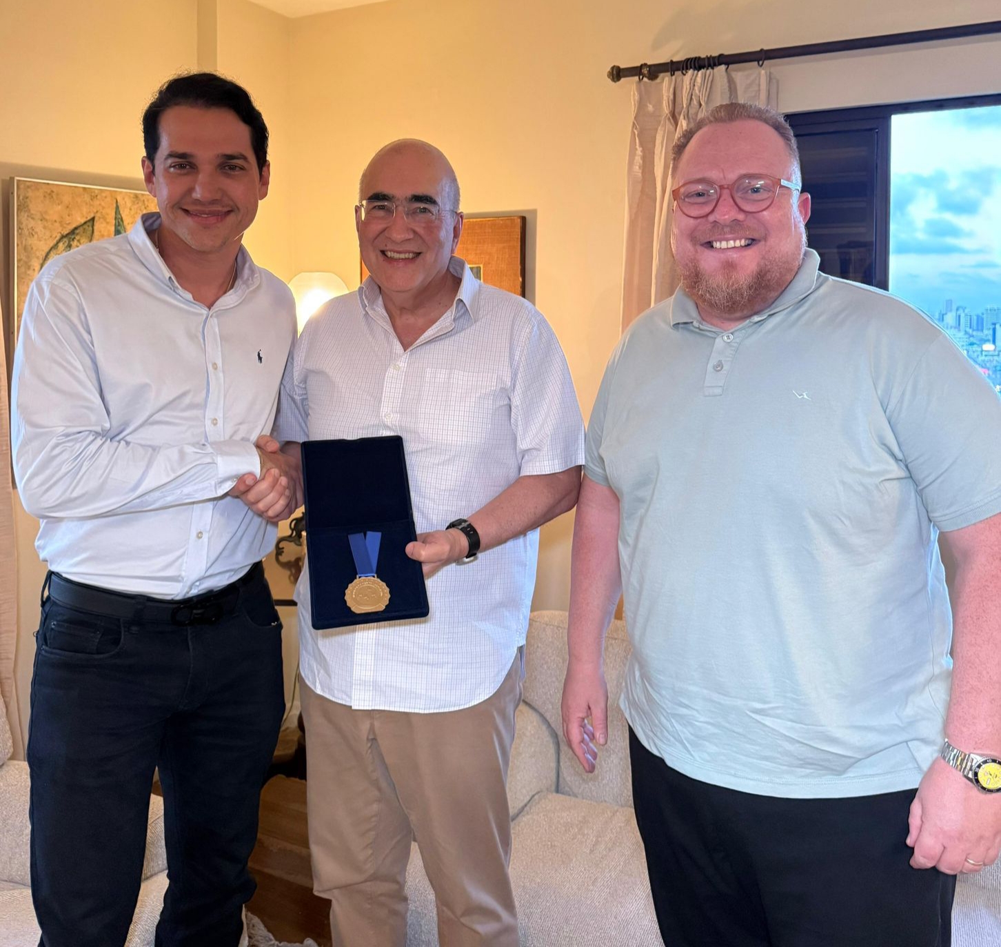 deputado estadual Kleber Rodrigues se reuniu nesta segunda-feira(29) com o embaixador do Brasil na China, Marcos Bezerra Abbott Galvão, para entregar ao diplomata a maior honraria concedida pelo Poder Legislativo do Rio Grande do Norte, em reconhecimento à atuação do embaixador na promoção das relações Brasil–China e na defesa de agendas que impactam diretamente o desenvolvimento regional. A Medalha do Mérito Legislativo 2025 foi concedida no ano em curso.O encontro em Natal dá continuidade às relações iniciadas em outubro, quando o deputado Kleber Rodrigues esteve em Pequim e se reuniu com o embaixador para tratar de aproximação institucional e oportunidades de cooperação entre a China e o Rio Grande do Norte. Kleber Rodrigues chefiou uma missão formada por prefeitos de municípios potiguares.O secretário adjunto da SEDEC, Hugo Fonseca, acompanhou o encontro e somou-se à agenda de articulação institucional, reforçando caminhos para impulsionar negócios, parcerias e investimentos com foco no crescimento econômico do estado.