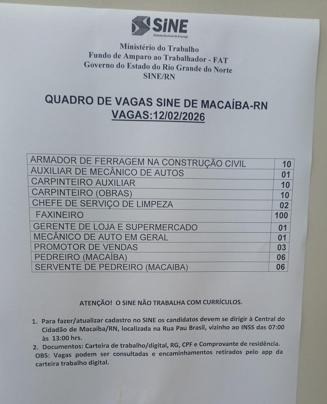 1.Para fazer/atualizar cadastro no SINE os candidatos devem se dirigir à Central do Cidadão de Macaíba/RN, localizada na Rua Pau Brasil, vizinho ao INSS das 07:00 às 13:00 hrs.