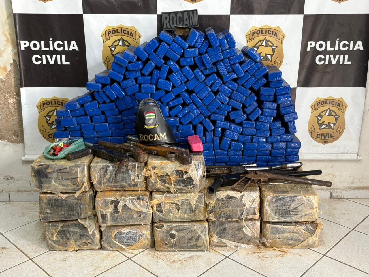 A Polícia Militar apreendeu cerca de 270 quilos de maconha durante uma ação na comunidade do Jucuri, na zona rural de Mossoró, nesta quinta-feira (12). Três homens, sendo dois irmãos, foram presos durante a ocorrência. A droga estava enterrada no quintal de um casa.De acordo com a PM, uma equipe foi acionada por populares que informaram que um homem armado estaria amedrontando a população. Inicialmente, no imóvel, ele não foi localizado. No entanto, durante a ação, os policiais visualizaram um suspeito tentando se evadir.“Enquanto a gente fazia a busca, na casa dos fundos, ele tentou se evadir. Quando a gente entrou, ele estava todo sujo de terra. Quando cavou, encontramos essa droga, além de quatro armas de fogo e uma moto roubada”, detalhou o tenente Fernandes, do 2º Batalhão de Polícia Militar.Segundo a PM, um dos irmãos já havia sido preso no ano passado com quatro armas de fogo. O outro, que estava com as drogas, foi a primeira prisão dele. “Ele disse que era dele, não sei se por ser primário”, acrescentou o militar.A ocorrência foi encaminhada para a Delegacia de Polícia Civil para os procedimentos cabíveis Navegação de PostPRF prende homem por furto de veículo e embriaguez ao volante em Caicó Visitante é flagrada tentando entrar com 30 papelotes de drogas no sutiã em penitenciária na Grande Natal