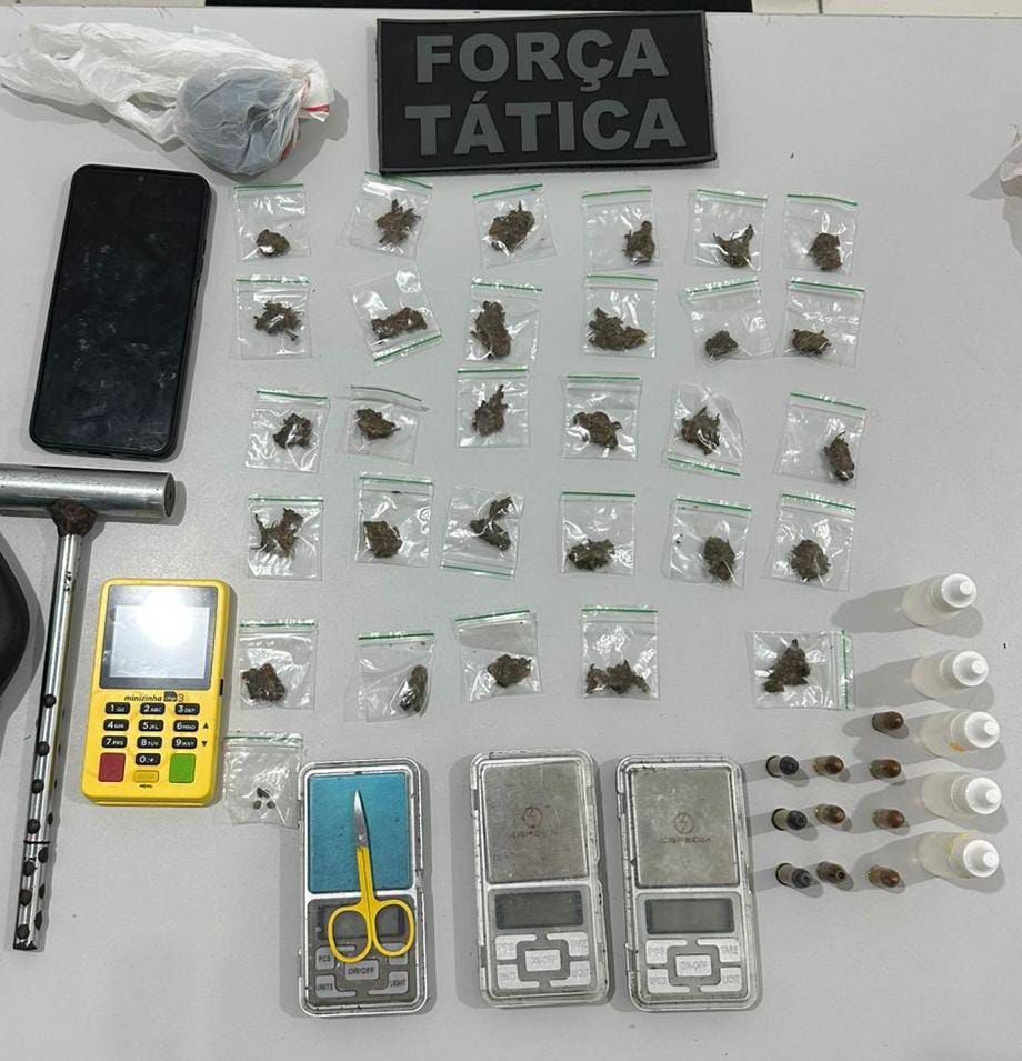 Guarnições da Tático Mike 01 e 02 realizaram a apreensão de entorpecentes e materiais ilícitos durante patrulhamento ostensivo no Conjunto Manoel Dias, em Macaíba. A ação ocorreu na Rua R. J. Dantas, quando os policiais visualizaram um indivíduo conhecido por Eduardo, que tentou se evadir ao perceber a aproximação das viaturas.